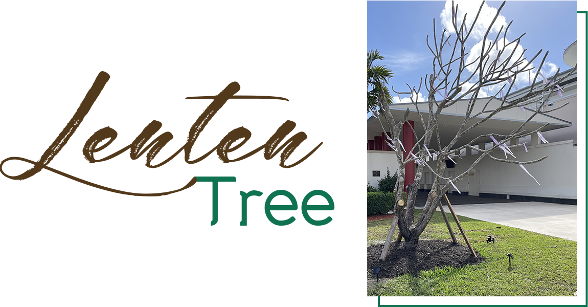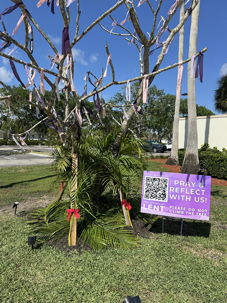 On Palm Sunday, palm branches are placed at the base and around the trunk. Symbols of welcome and victory as Jesus entered Jerusalem.