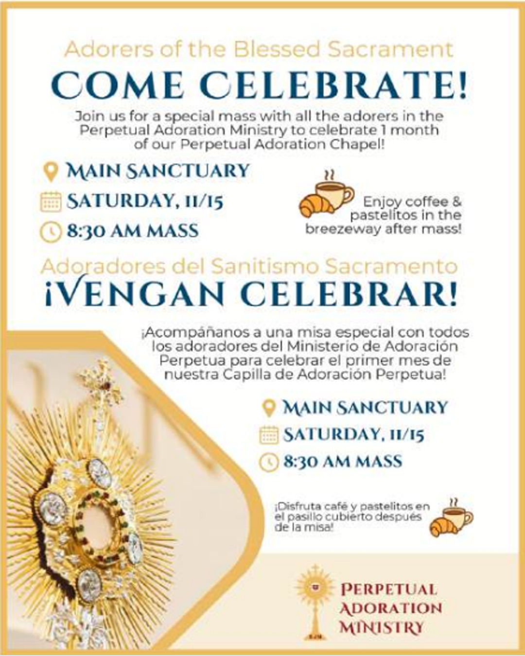 ¡Acompáñanos a una misa especial con todos los adoradores del Ministerio de Adoración Perpetua para celebrar el primer mes de nuestra Capilla de Adoración Perpetua!