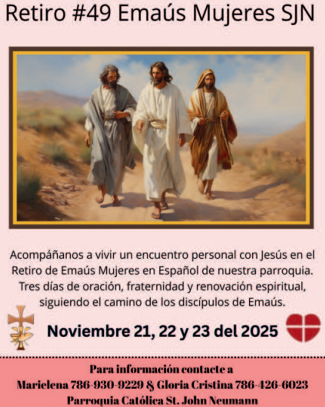 Acompáñanos a vivir un encuentro personal con Jesús en el Retiro de Emaús Mujeres en Español de nuestra parroquia. Tres días de oración, fraternidad y renovación espiritual, siguiendo el camino de los discípulos de Emaús.